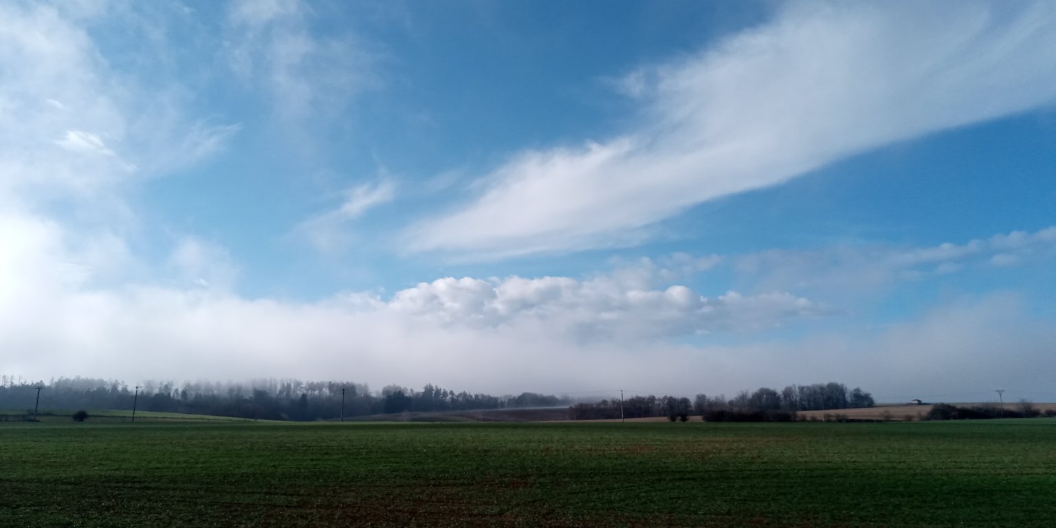Polojasno, od JZ přibývá oblačnost. Vlhkost 66%, vánek, pocitová teplota 4,6°C. Nad 800 m se ještě drží mráz.