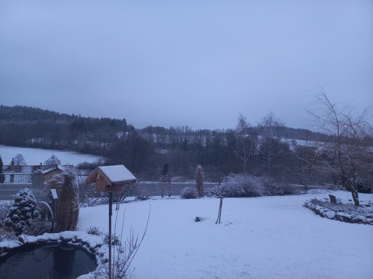 0,4°C, Zataženo, Sníh: nesouvislý. Všude kolem je souvislý poprašek, ale na zahradě už je nesouvislý...