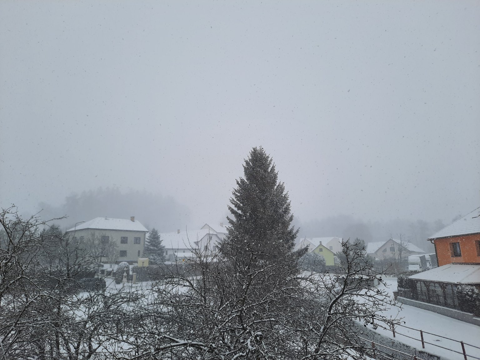 Vítr S 3,4 km/hod. Začalo sněžit, hromady sněhu snad tak brzo neroztají.