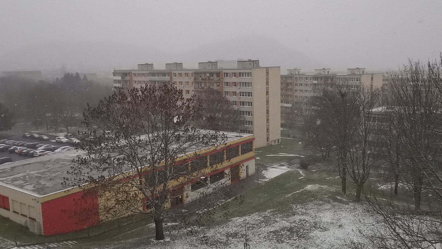 Silné sněžení s proměnlivou velikostí vloček, za hodinu 2 cm sněhu.
