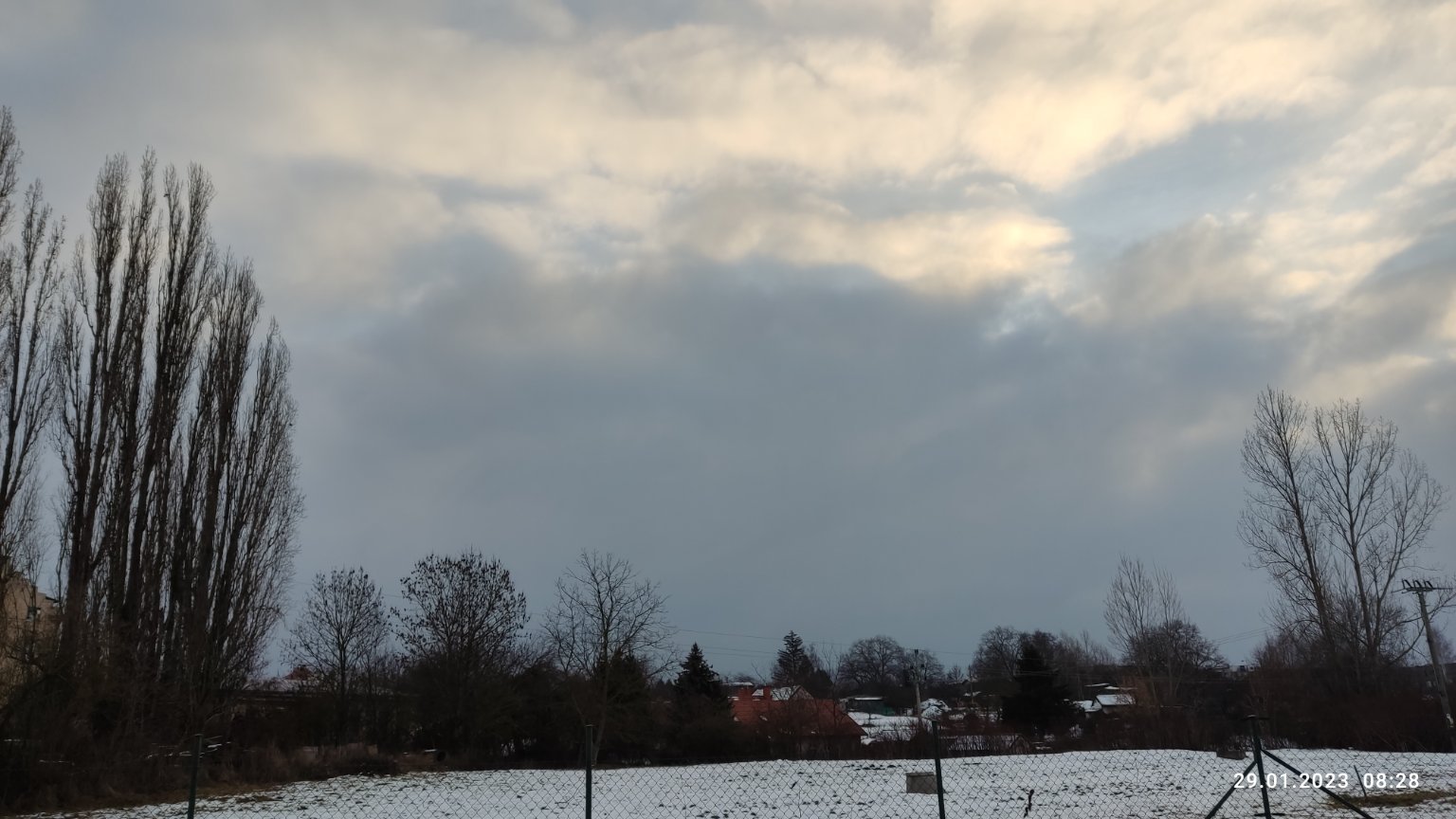 Oblačnost 100%, tlak 1025,57hPa→, poc.teplota -7,12°C, tepl.ros.bodu -6,14°C, rel.vlhkost 85,6%, abs.vlhkost 3,10g/m3, slabý SSZ vítr 343° 1,88m/s(2 Bft), včerejší průměrná teplota -1,39°C, délka dne 09:16:05, sluneční záření 13W/m2.