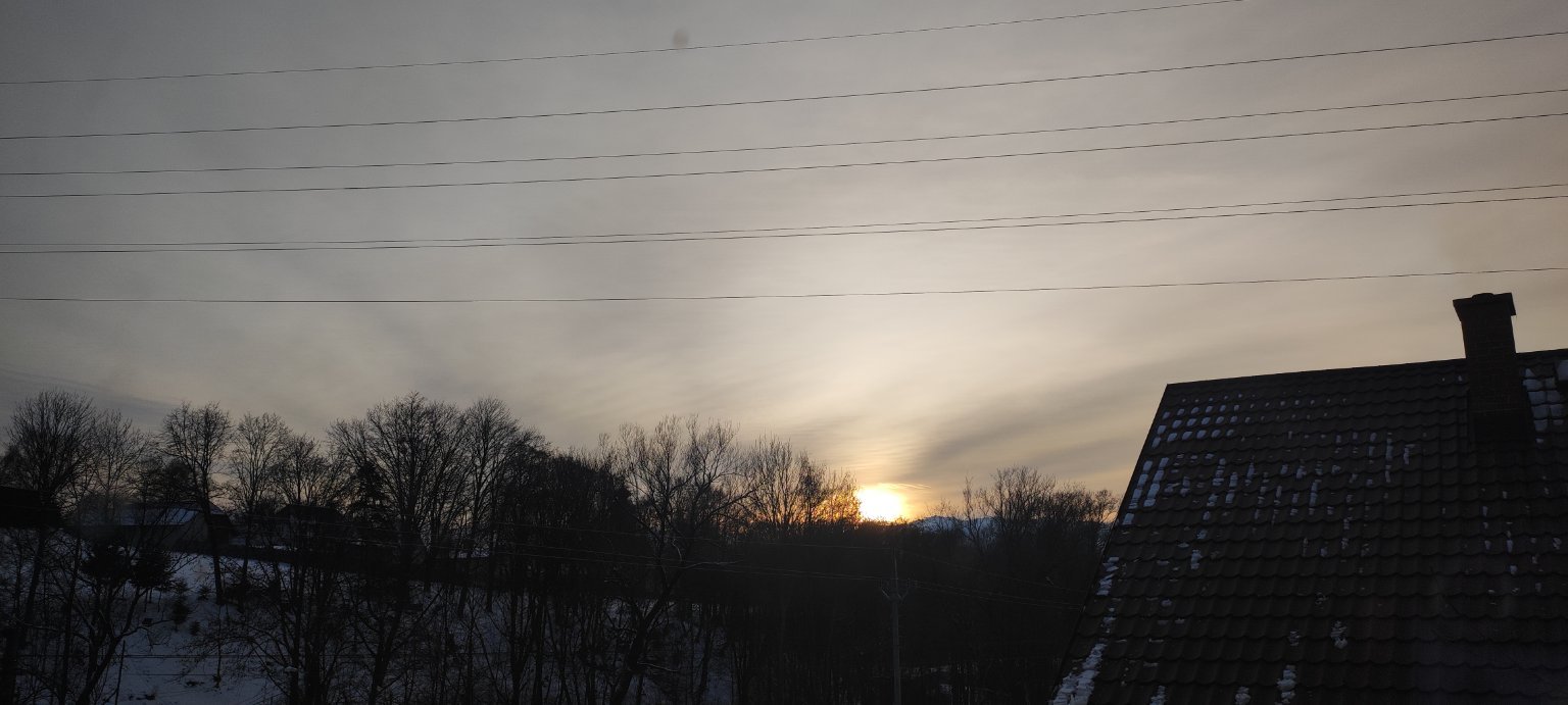 Přes den se protrhala oblačnost až na aktuální polojasno. Sníh dole ve městě nes., trošku výše kolem 5 cm, cca od 500 mnm se stále drží 10-15 cm. Sníh tvrdý, zmrzlý. V pozadí nadm. výška 630 mnm. Foceno ve 375 mnm.