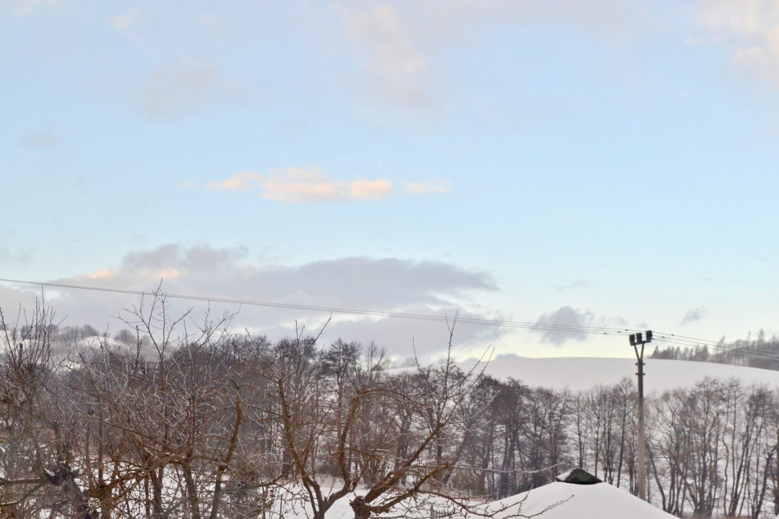 Četné přeháňky, tlak 1011,3 hPa, ZSZ vítr 4-7 m/s. Sníh ale díky kladné teplotě nedrží.