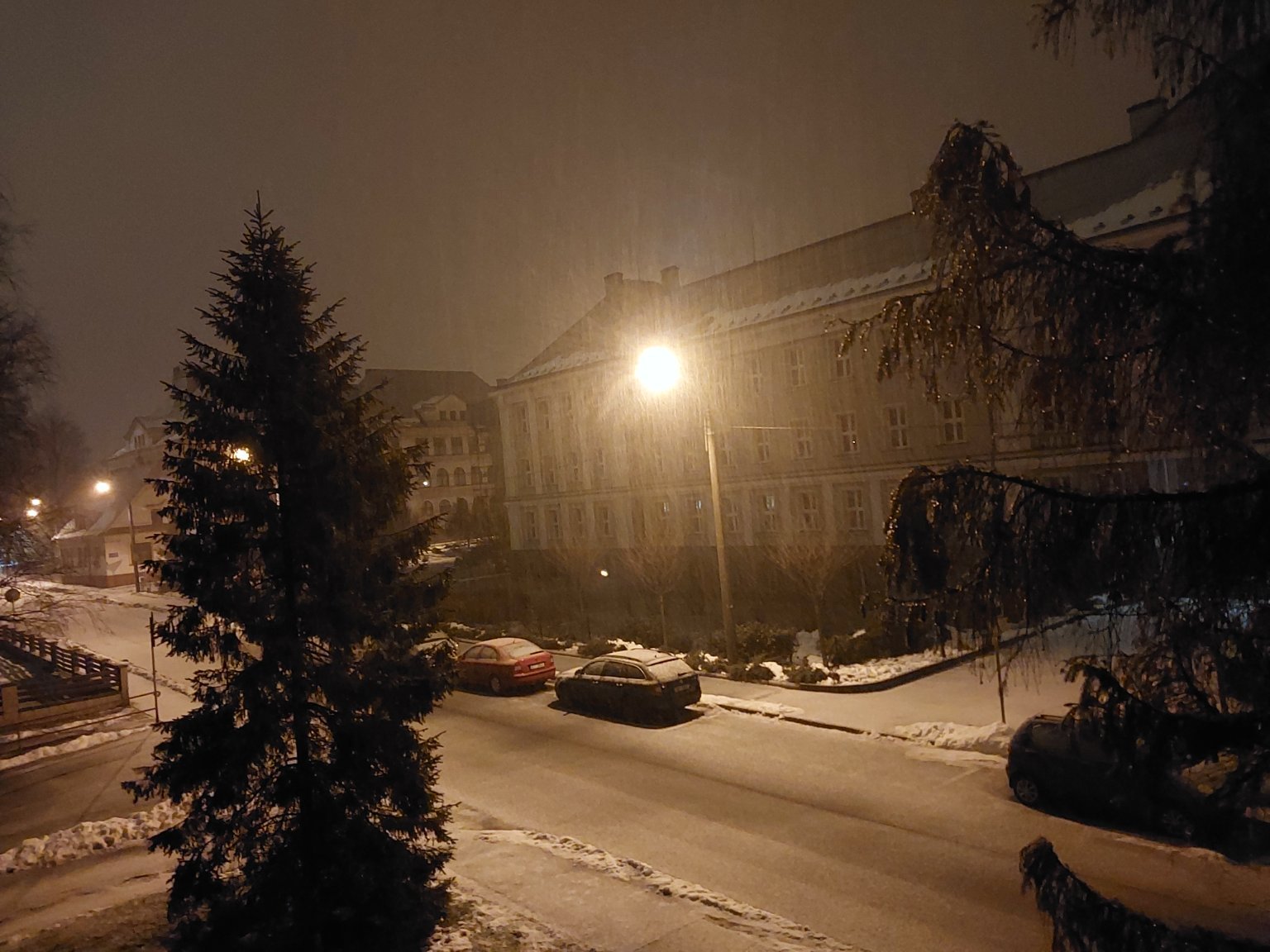 Silné sněžení, tlak 1013,4 hPa (slabý vzestup), ZSZ vítr 4-8 m/s.
