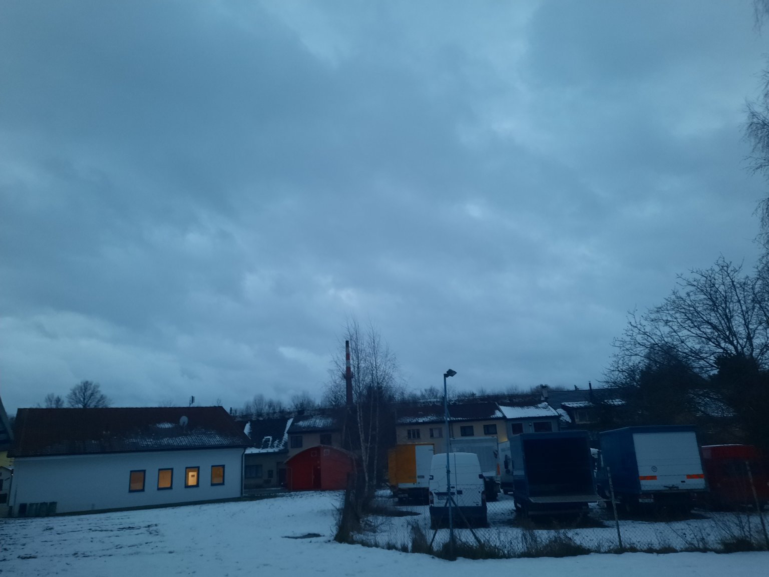 2,8°C, Velmi slaba až slabá sněhova přehaňka, Sníh: -. Na pár minut začalo sněžit, zvlaštni světlo v Polsku, je pozorovatelné už několik let.
