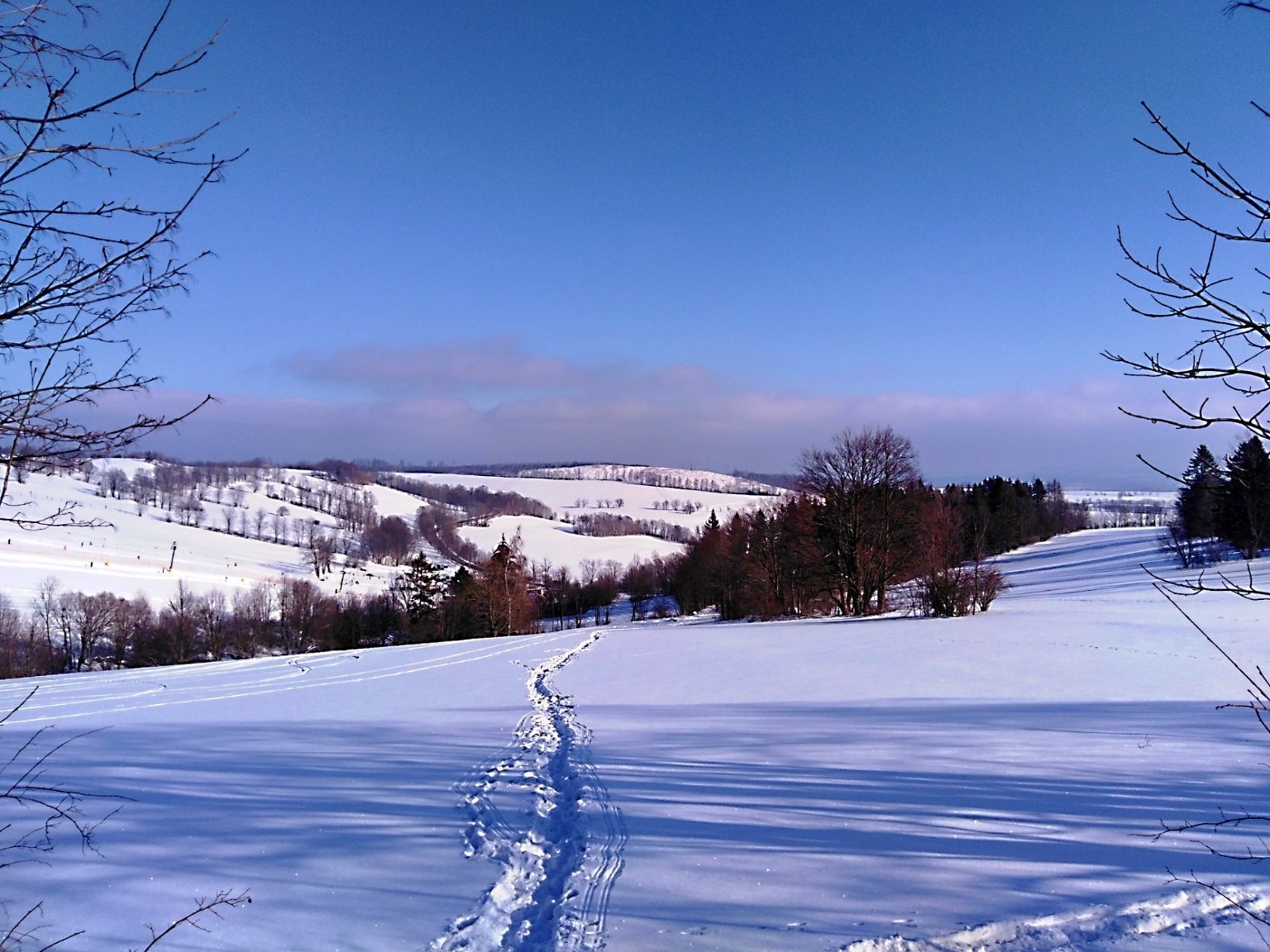 skoro jasno, -1°C / foto z pekelného kopce 570m.m.n. zde je zmrzlá vrstva sněhu do 7cm
