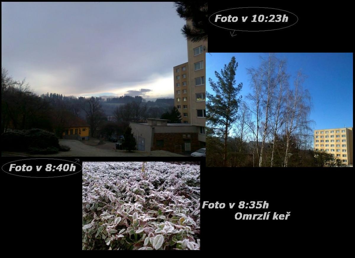 Téměř se vyjasnilo,začal foukat slabý vítr,tlak 1004hPa,vlhkost 78%.Foto v 10hod.
