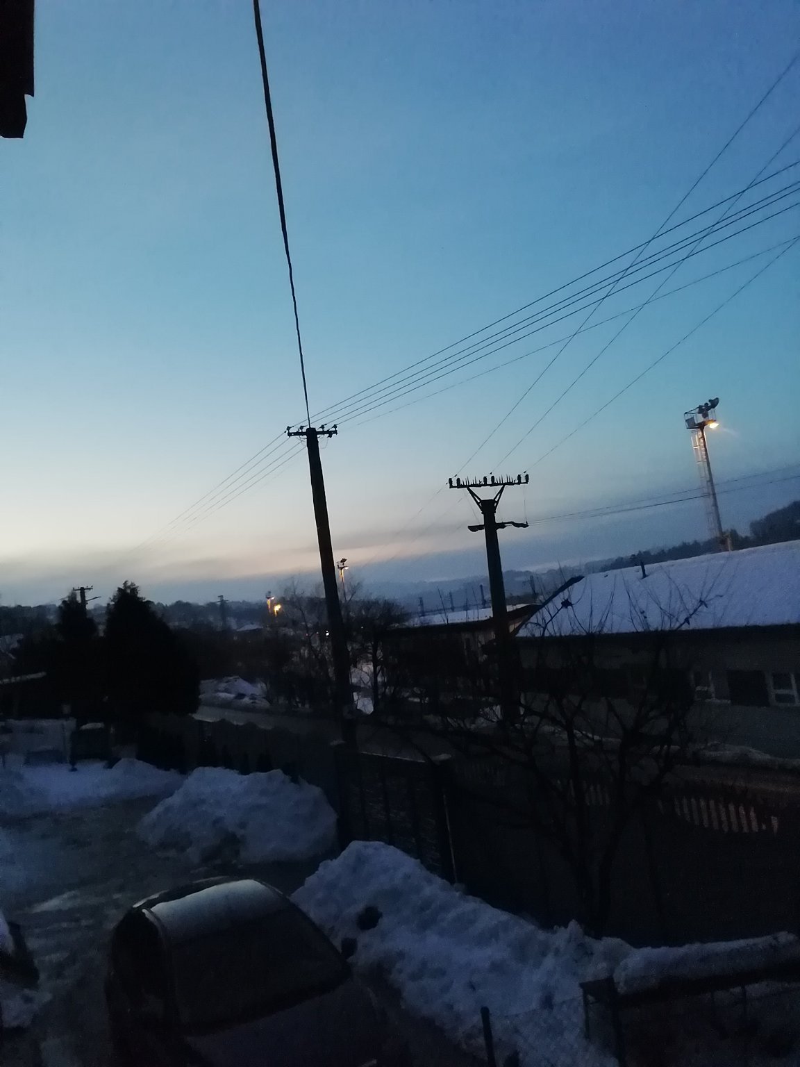 3,6°C, Skoro jasno až polojasno, Sníh: nesouvislý. Opět soumrak ale červanky navíc.