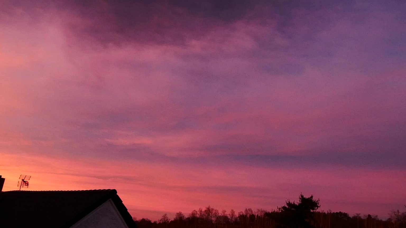 malá oblačnost, nasvícená vysoká oblačnost zapadajícím Sluncem