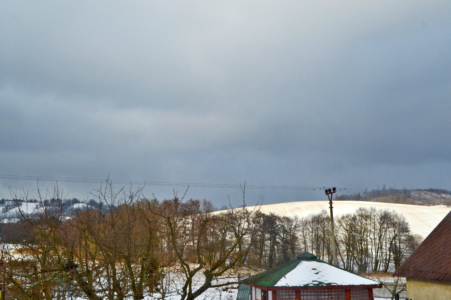 -0,2°C, Slabá až velmi slaba sněhova přehaňka, Sníh: nesouvislý. Podobně jako včera, jen teď už slabši... Jo, dopoledne sněžilo silně až mirně! Jinak snad se oblačnost protrha aby jsem mohl zkusit pozorovat tu Polární zaři...