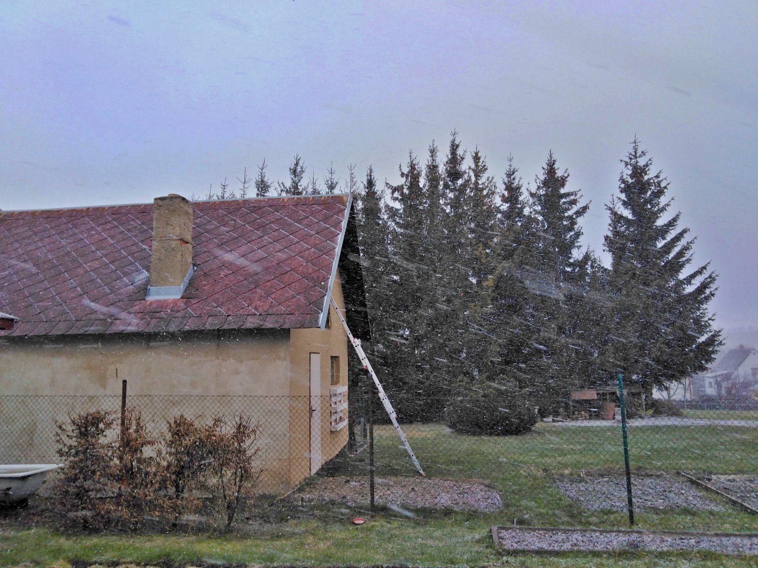 -0,5°C, Velmi silné až silné sněženi, Sníh: 5 cm. Teď teda chumelí, ale dopoledne chumelilo ještě víc.
