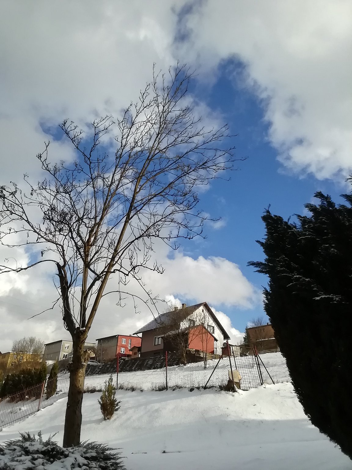 Silný vítr,silné sněhové přeháňky. Ráno cca 4cm sněhu.