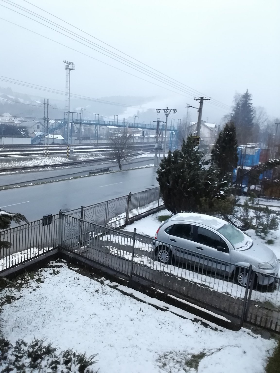 Zataženo, sníh, vlhkost 63%, bezvětří. Příval obřích vloček.