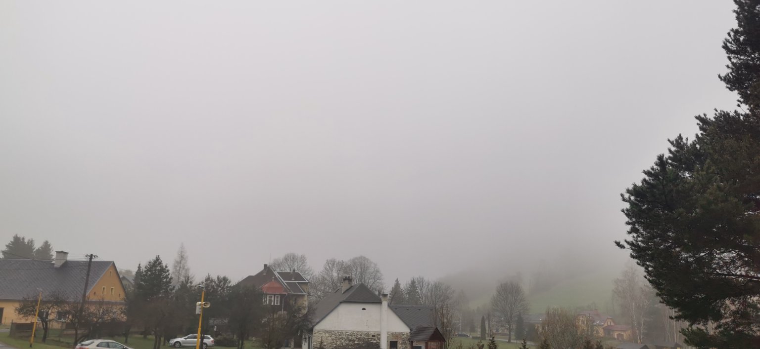 3,6°C, Zataženo až oblačno. Sníh roztál, jen v Antoničku a na kopci nad farmou jsou ještě zbytky.