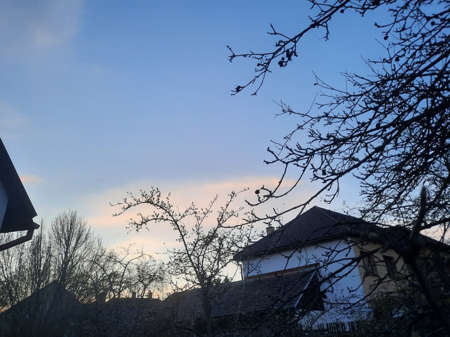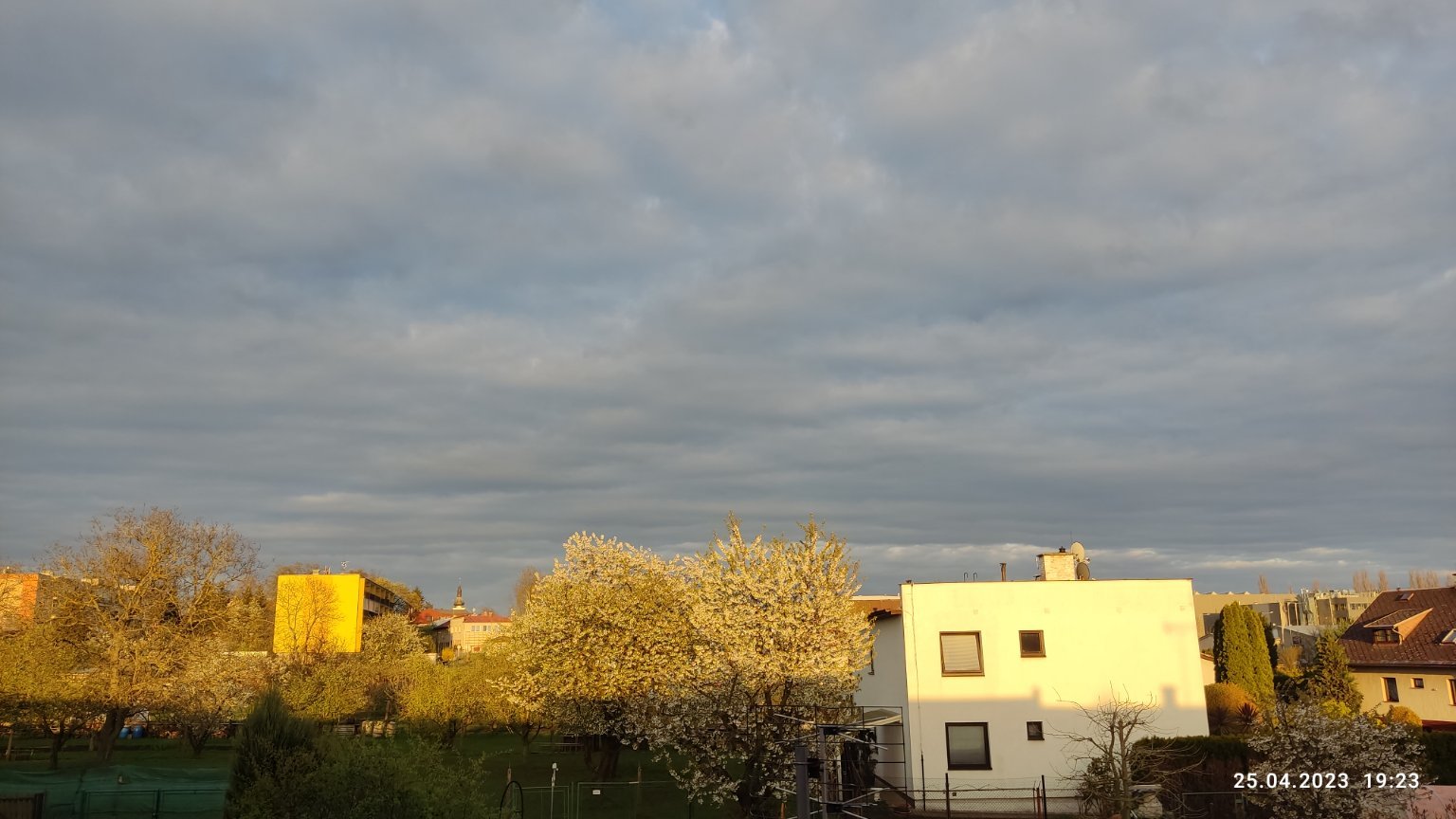 Vlhkost 52%, Vítr slabý S, 2,2 m/s, v nárazech 5,4 m/s. Polojasno, slunce zapadá. Za pondělí a úterý ráno rovných 12 mm srážek.