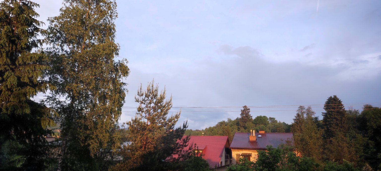 Dle radaru i mraků to vypadalo nadějně, ale realita opět taková, že to při příchodu hodně zesláblo a padá pouze slabší deštík. Škoda, to hlavní šlo opět jinudy :( Tak alespoň duha (fotka směr JV, ze Z svítí slunce ...)