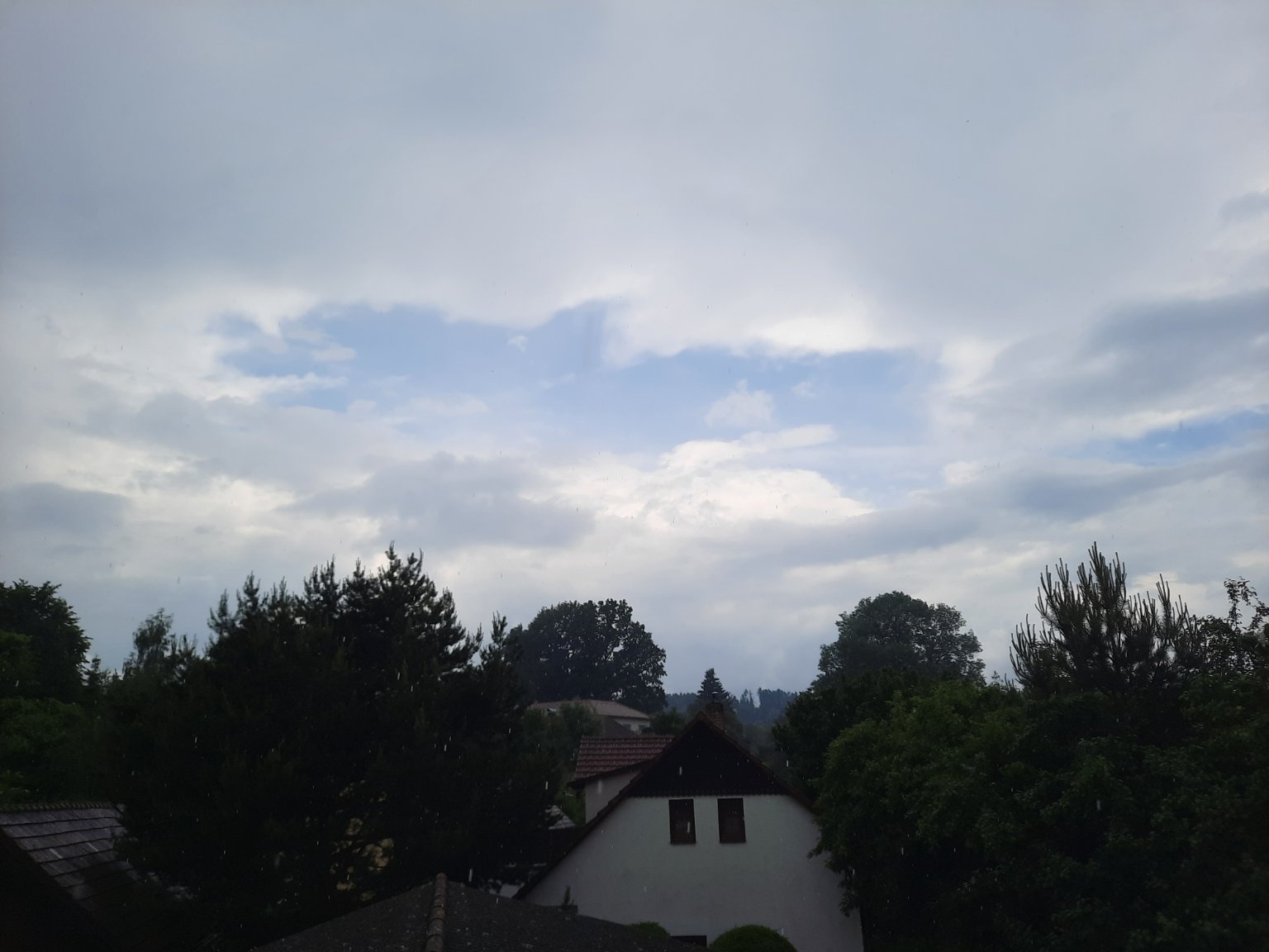Bouřka a hustě prší. SSZ vítr 8 km/h, tlak 1013 hPa, vlhkost 78 %.