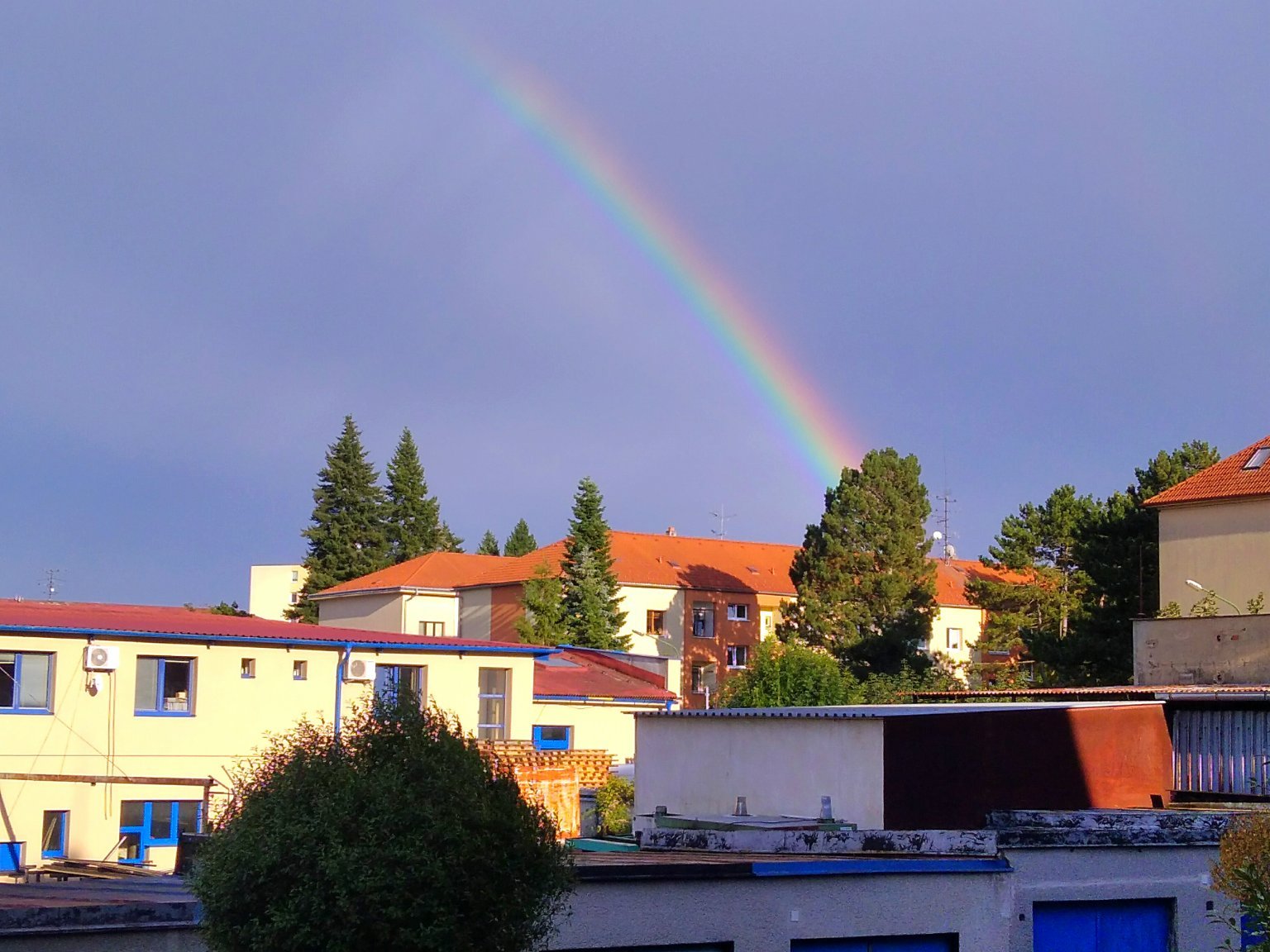 Od JZ se blíží další přeháňky, z oblačnosti jsou patrné srážkové pruhy.