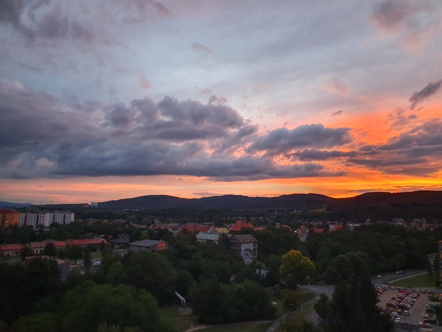 nasvícená dešťová přeháňka zapadajícím sluncem, timelapse