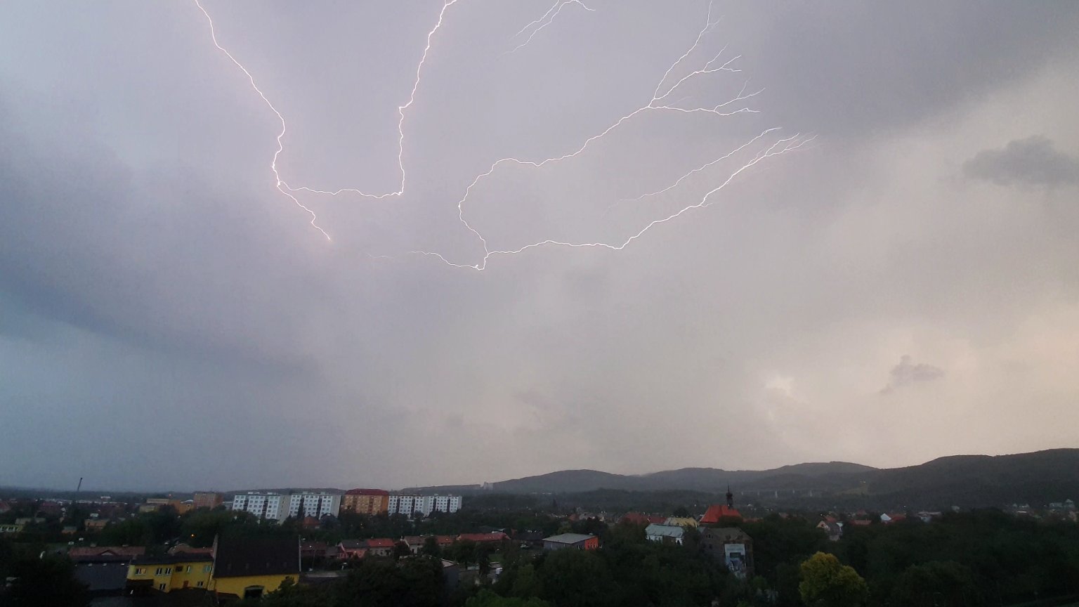 Večer již klidný, ale včerejší večerní a dnešní bouřky byly opravdu velmi silné. Včera spadlo 33 mm, dnes 44 mm. Celkem za cca 16 hodin 77 mm.