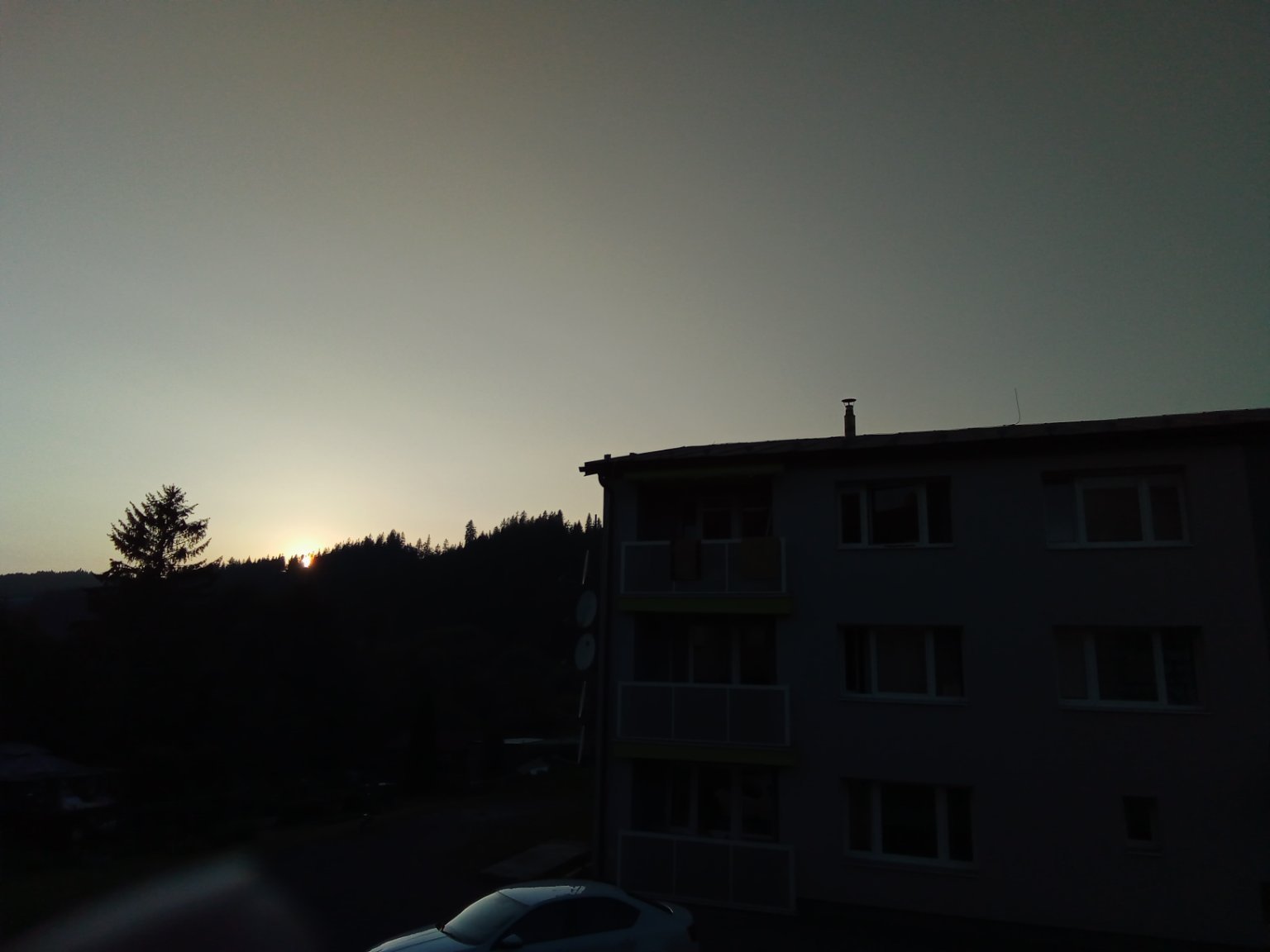 21,2°C, Jasno. Slunce zapadá, je fajně.