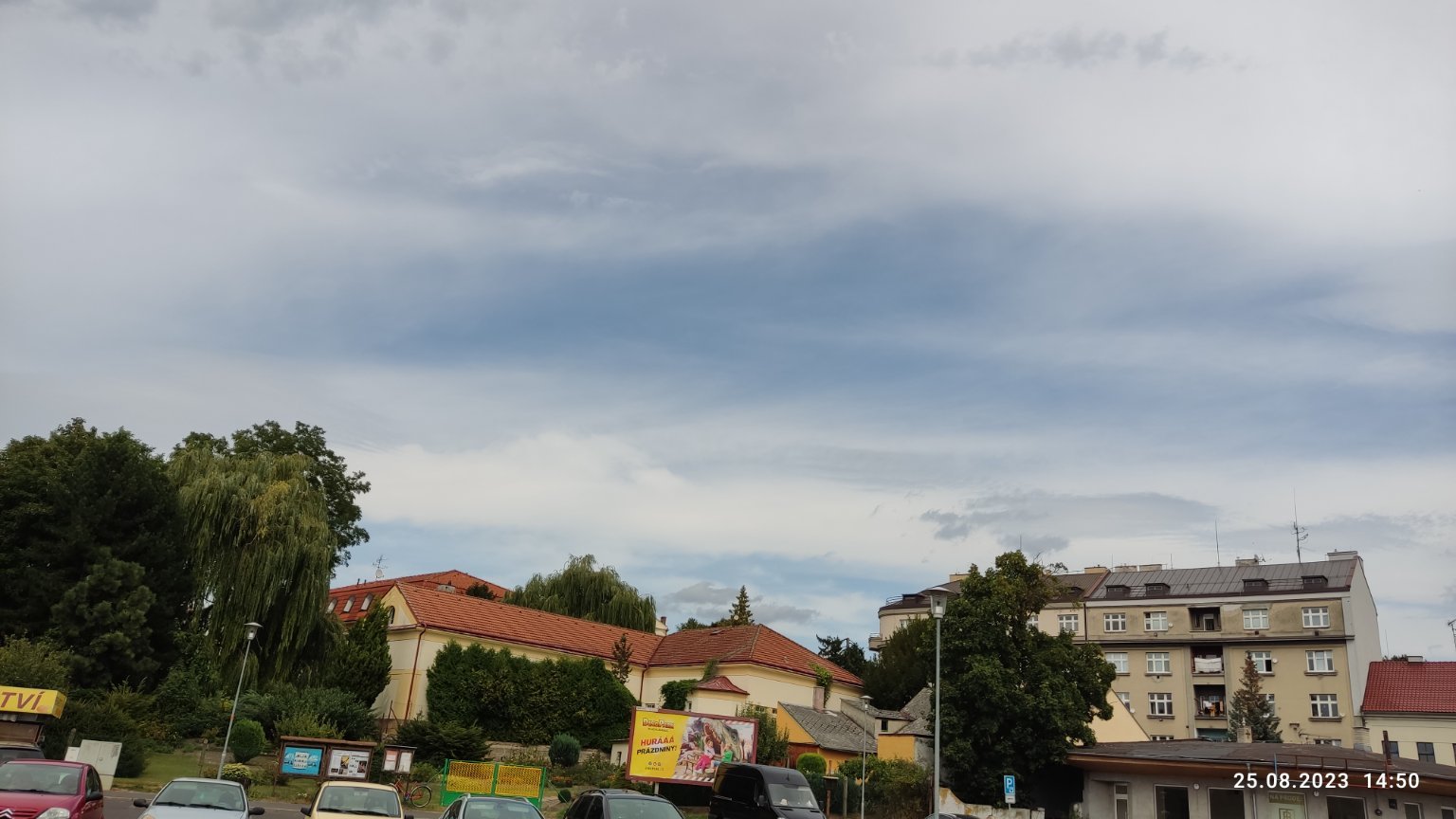 Oblačno, na bouřky to úplně není. Teplota: 30.1°C, Vlhkost: 44%, Tlak: 1011.4 hPa (stabilní).