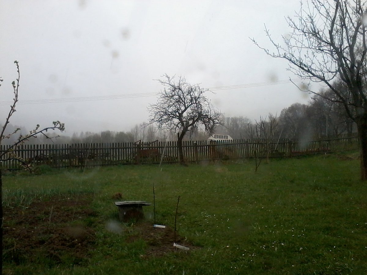 Vlhkost 44%, tlak 1021.1hPa vzestup, mírný SZ vítr. Cumuly nad Prahou - cumulus mezi stromy.