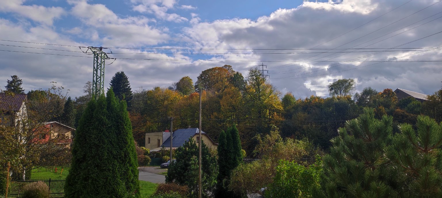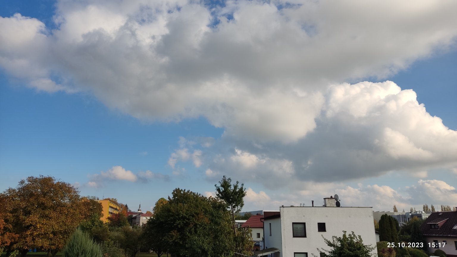 Za studenou frontou kupovitá oblačnost, bezvětří, je hezky. Teplota: 15.3°C, Vlhkost; 72%, Tlak: 1002.5 hPa (klesá).