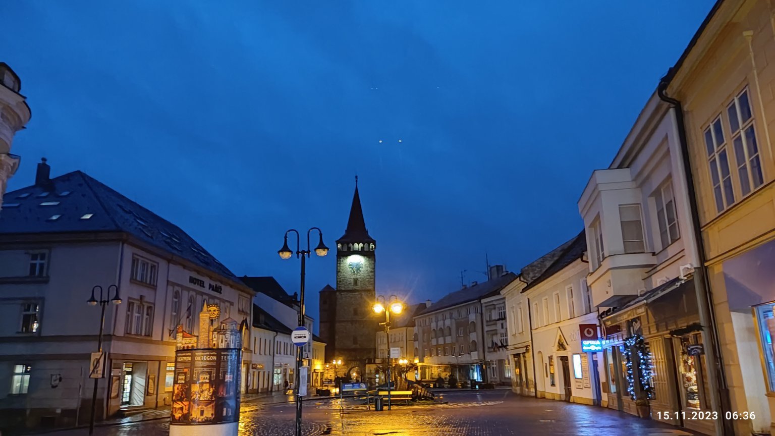 9,6°C, Zataženo až oblačno, Sníh: 0 cm. Trošku jsou přes oblačnost vidět hvězdy.