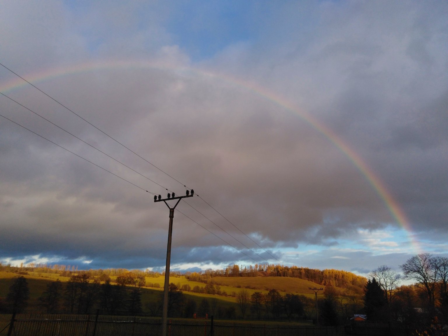 Duha po slabé přeháňce, oblačno. Vítr se uklidnil