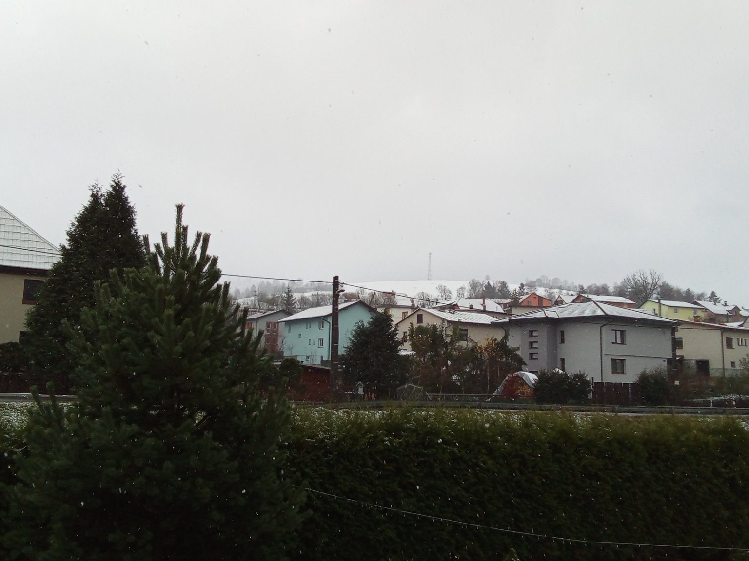 1,4°C, Slabé sněženi, Sníh: 0 cm. Žene se chumelenice, tohle není ono.