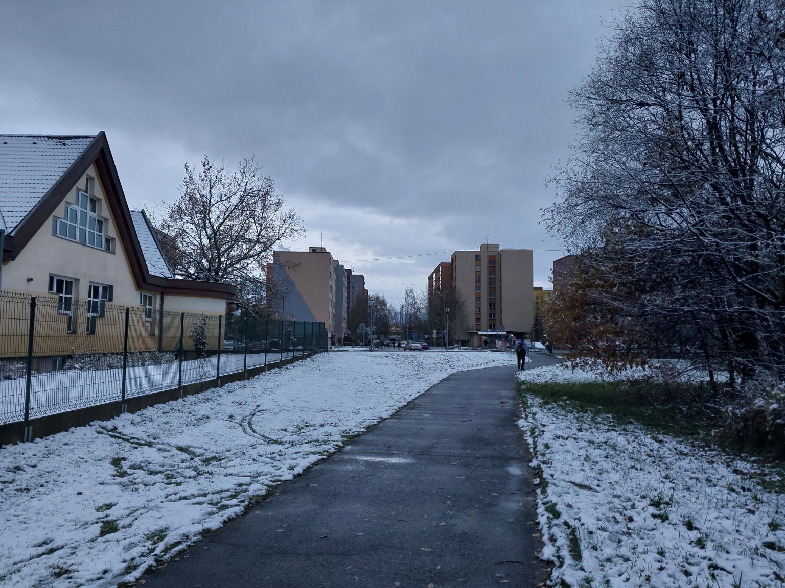 Mírné až silné sněžení, máme 1cm sněhu. Na chodnících se to od prohřátého povrchu nedrží.