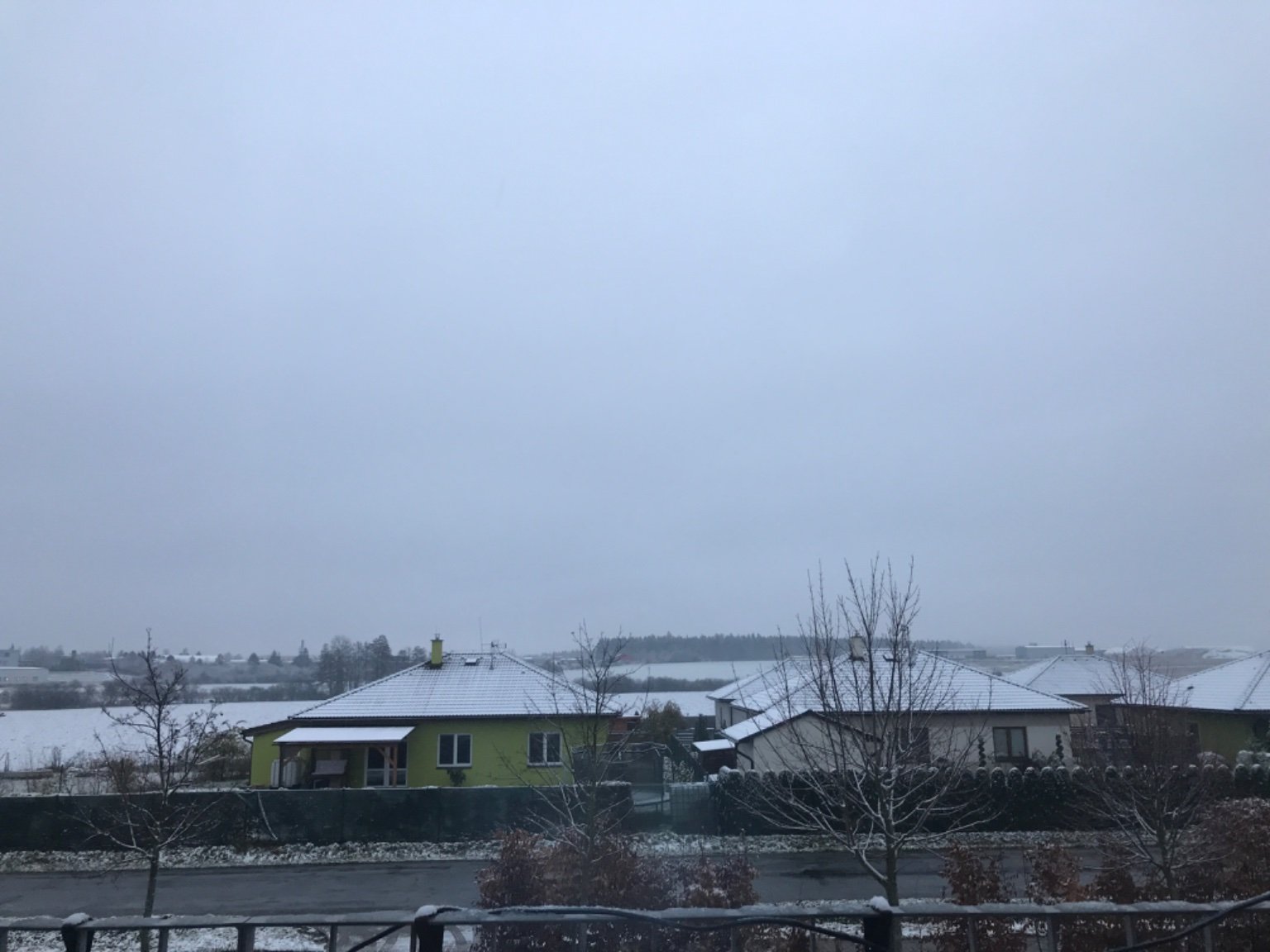 Zataženo, drobné sněžení, klidno, tlak 1009 hPa.