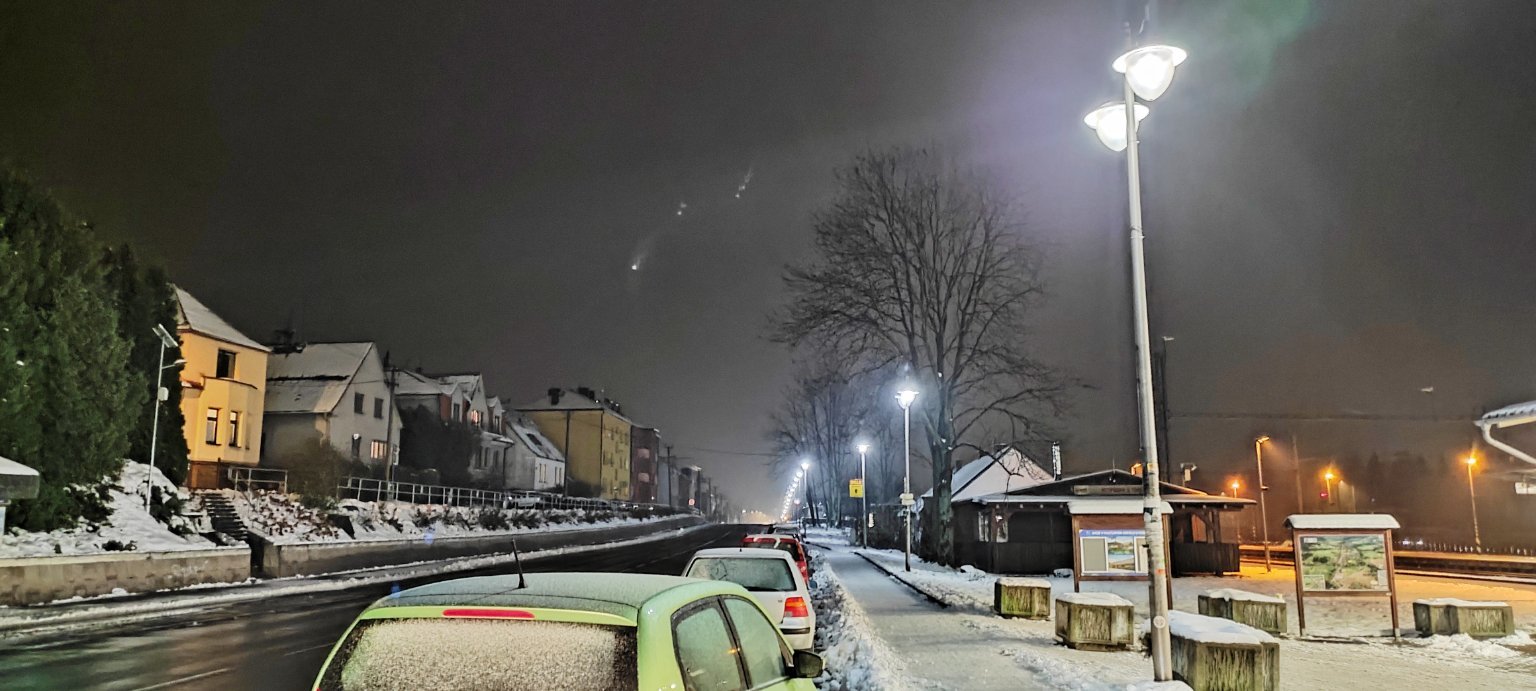 Aktuálně převažuje většinou zataženo a trvalejší slabé až mírné sněžení a fouká většinou slabý až mírný vítr, přechod k mrazu už působí problémy na silnicích