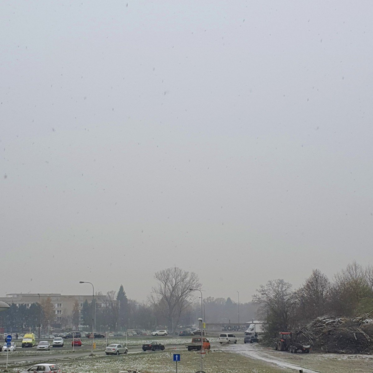 Zataženo, slabé sněžení. Připadl místy až 1 cm, od rána