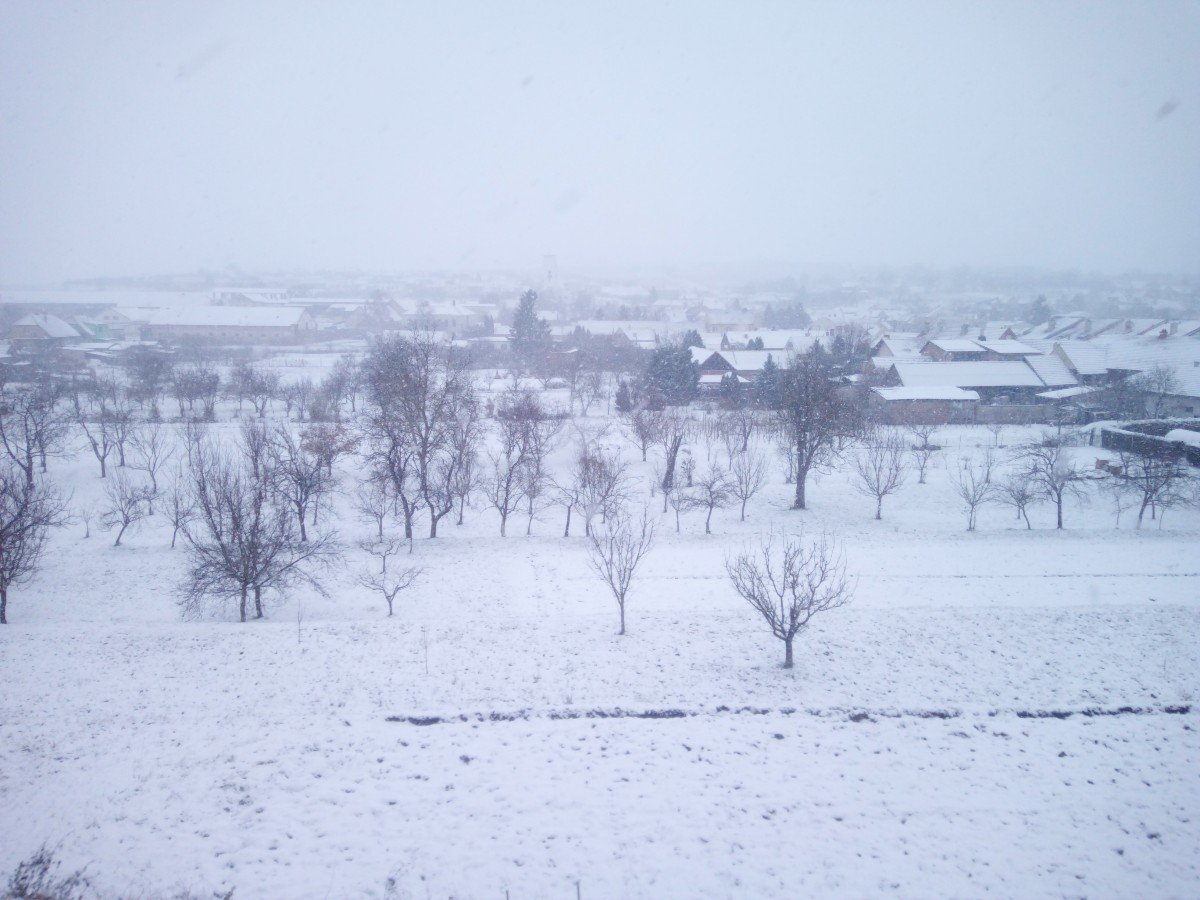 Intenzivni snezeni, zasnezena silnice, naposolena. Pokud to neni nutne, nedoporucuje se jezdit v aute.