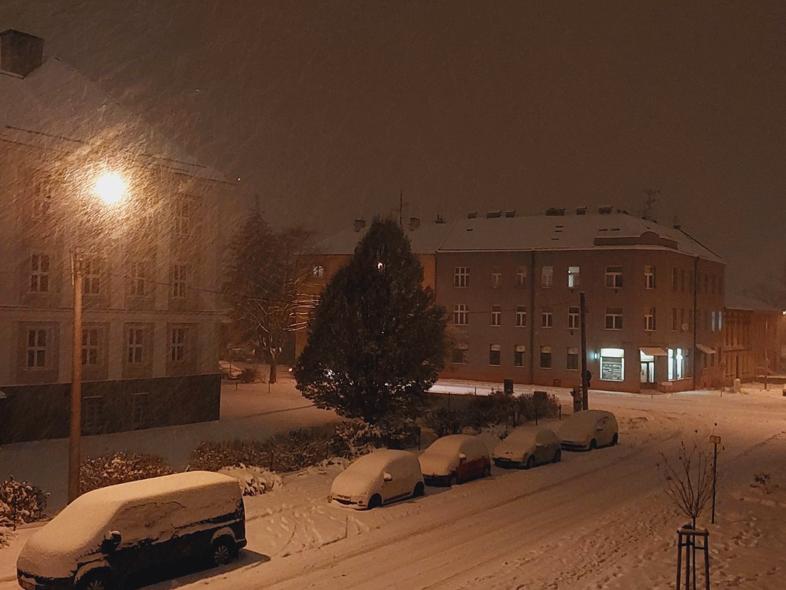 Pořád sněží, ale už jen slabě. Pokrývka tu dosahuje bezmála 50 centimetrů, což jsem v centru Budějovic neviděl minimálně 10 let, masakr.