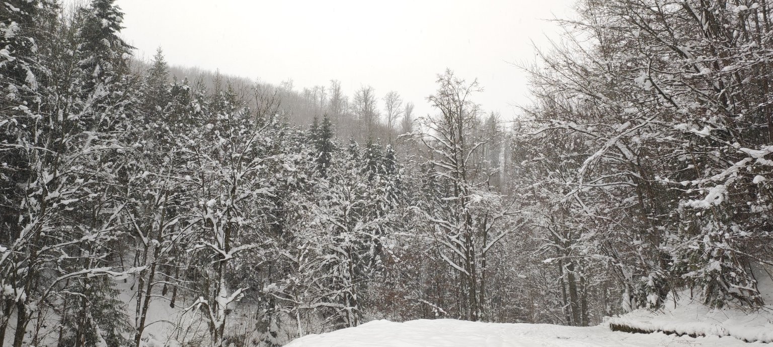 0,2°C, Mírne sněženi, Sníh: 34 cm. Asfaltové cesty v lesích vůbec nejsou upravené, ale tady to ani neni třeba...