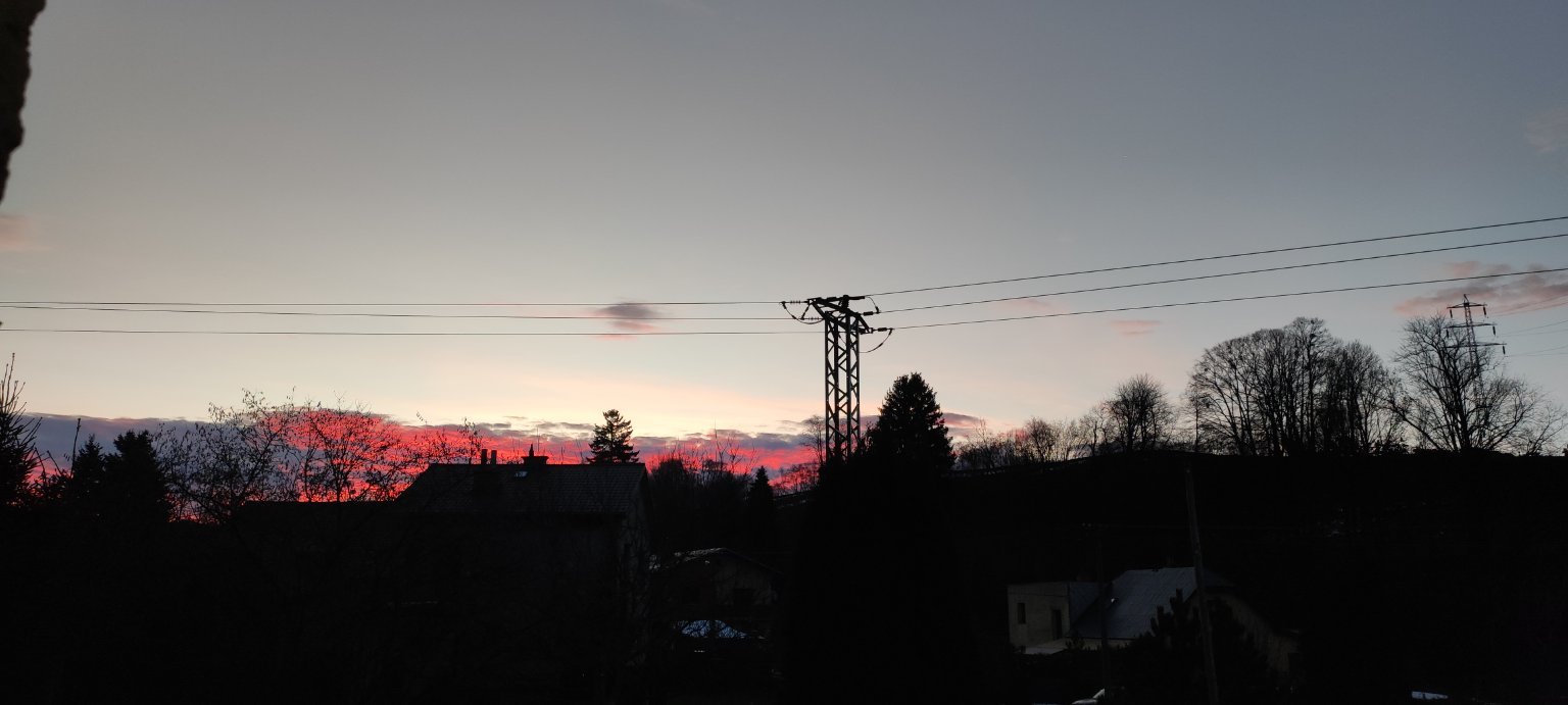 Oblačno, východ slunce. Teplota: -2.2°C, Vlhkost: 99%, Tlak: 1024.1 hPa (klesá).