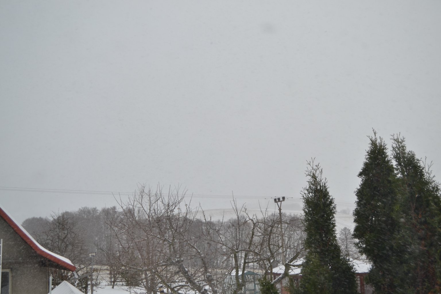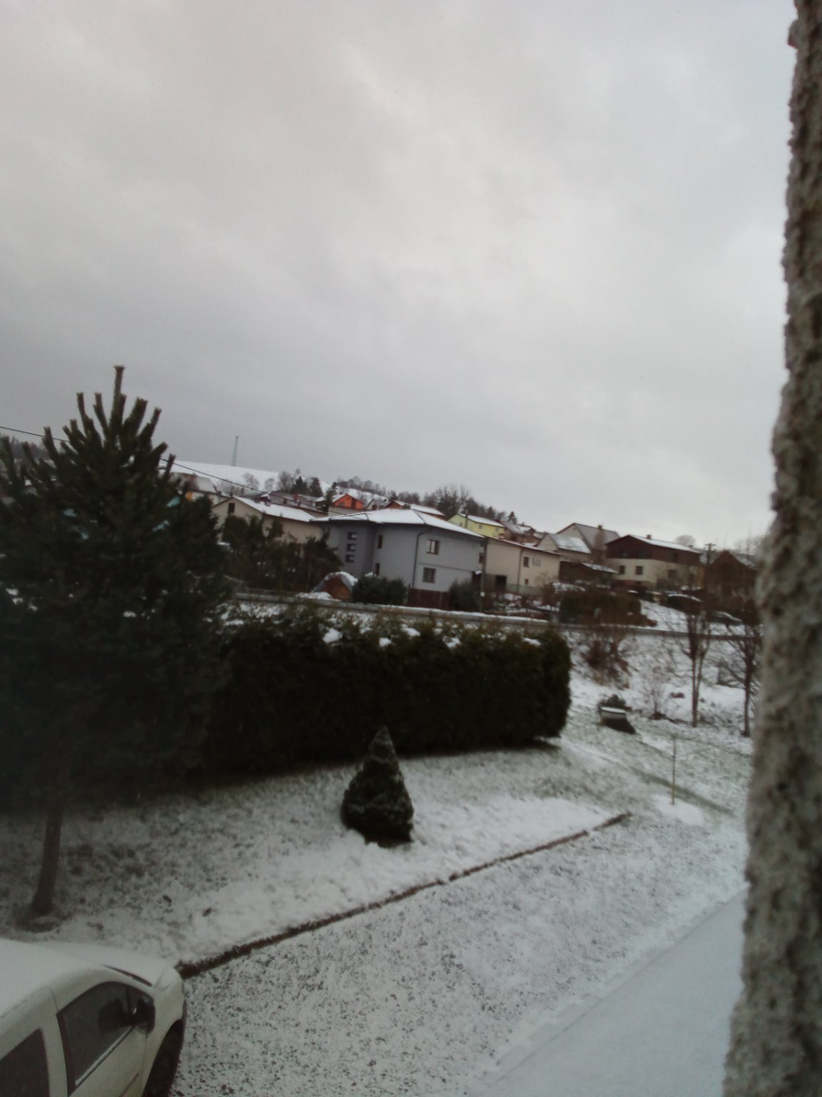 -°C, Mírne sněženi, Sníh: poprašek. Je tu taky malý problem, jsem na kolobajdě, no cesta domů bude sranda.