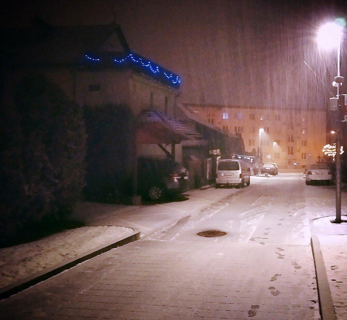 sněžení silné trvalé. asi 4cm kusy padají teď. pěkně mokrý, vše už obaluje