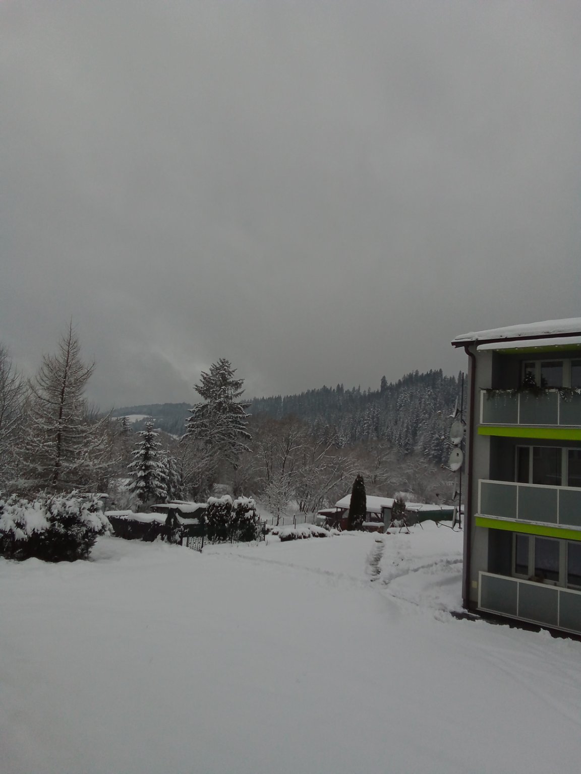 3,5°C, Velmi slabý dešť, Sníh: 10 cm. Je to břečka... Ale i tak je to hezči, než kdyby sníh nebyl.