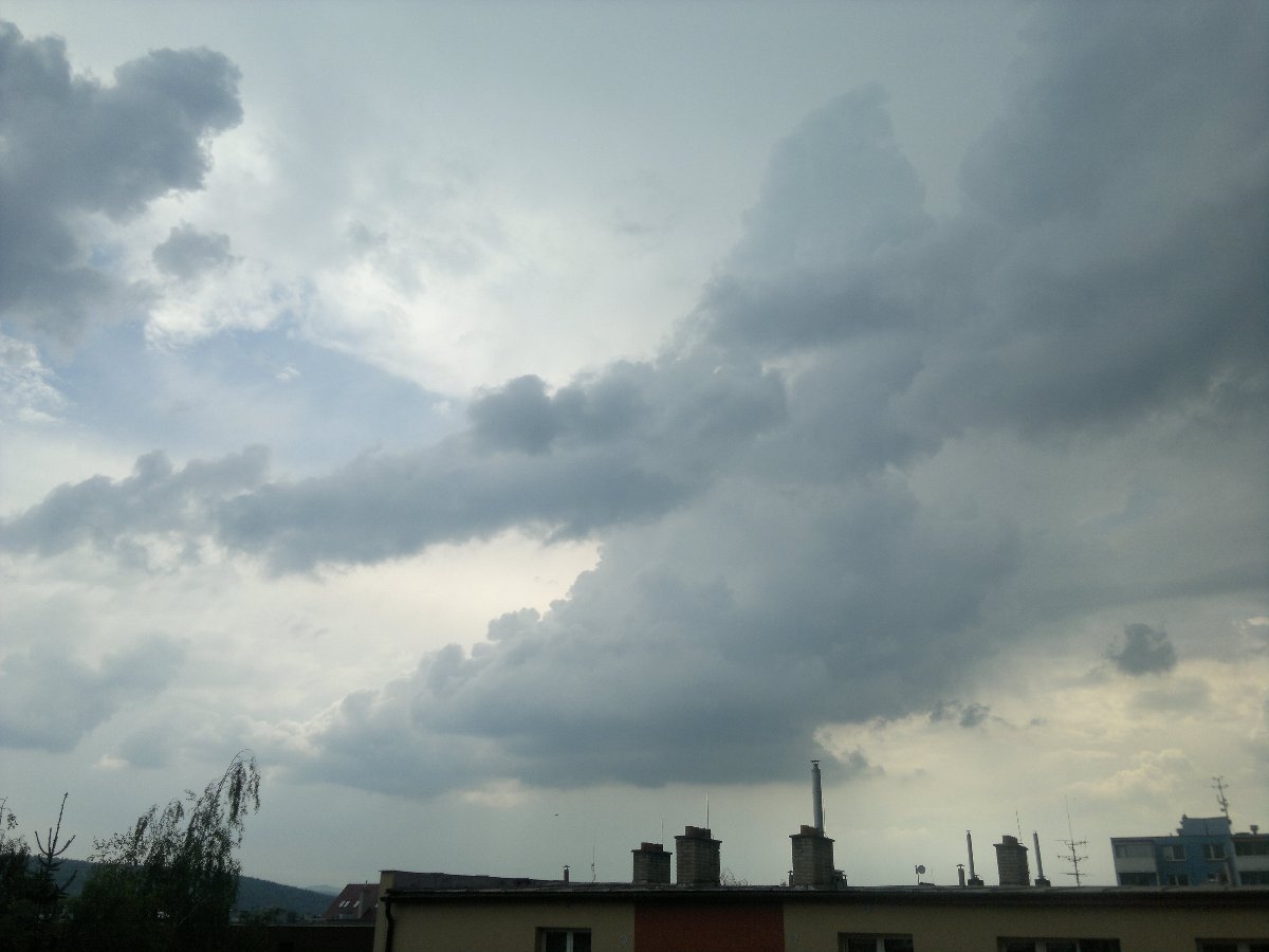 Tak nas mezi 12 az 13 hod nas prosla bourka, byl nani slusnej slejvak a obcas i blesk uhodil do zeme. Vitr byl myrny az cerstvy potom uz bezvetri. Po bource jeste slabe prselo a to do 13:30 hod. Tet je oblacno a vitr je slaby. Jo a pri bource teplota klesla s 20 na 15 st.