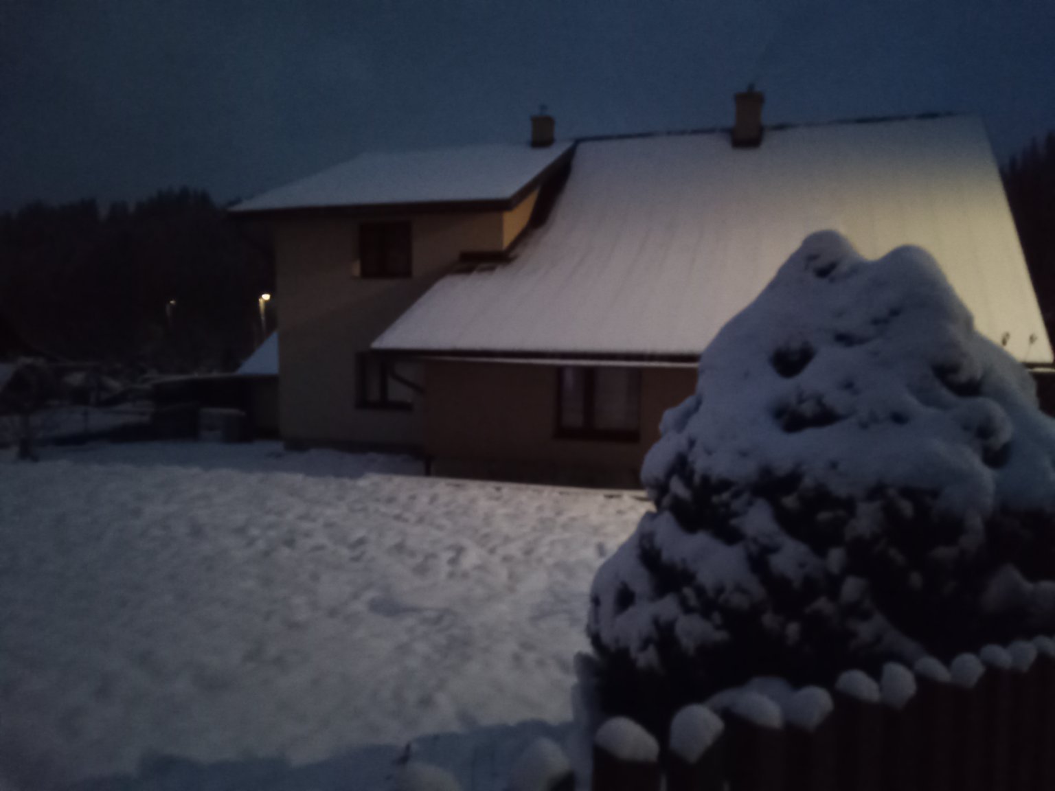 Během dne i polojasno, teď zataženo a fouká studený mírný vítr. Fotka z procházky v lese po obědě ?.