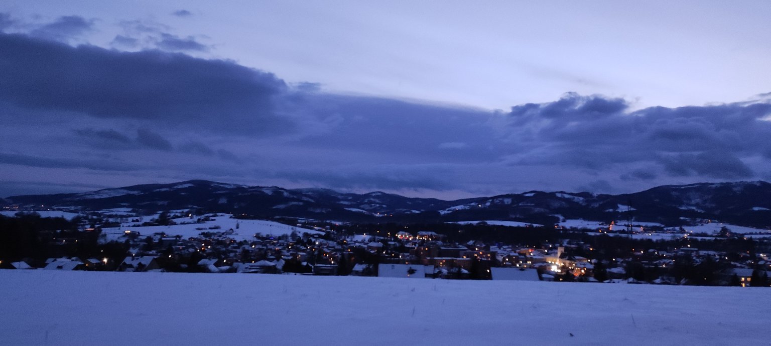 -°C, Oblačno až zataženo, Sníh: 11 cm. Výhled na Radvanov a Záhůří.