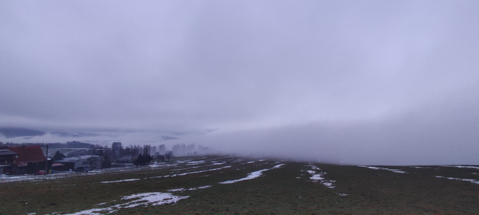2,1°C, Silná až velmi silná mlha, Sníh: nesouvislý. Břizy v mlze.