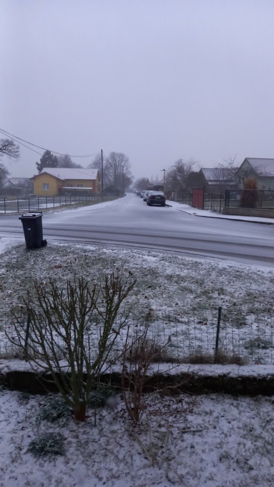 -0,2°C, Slabe sněženi, Sníh: nesouvislý. Padají krupky, možna bych tomu mohl řikat i zmrzlý dešť...
