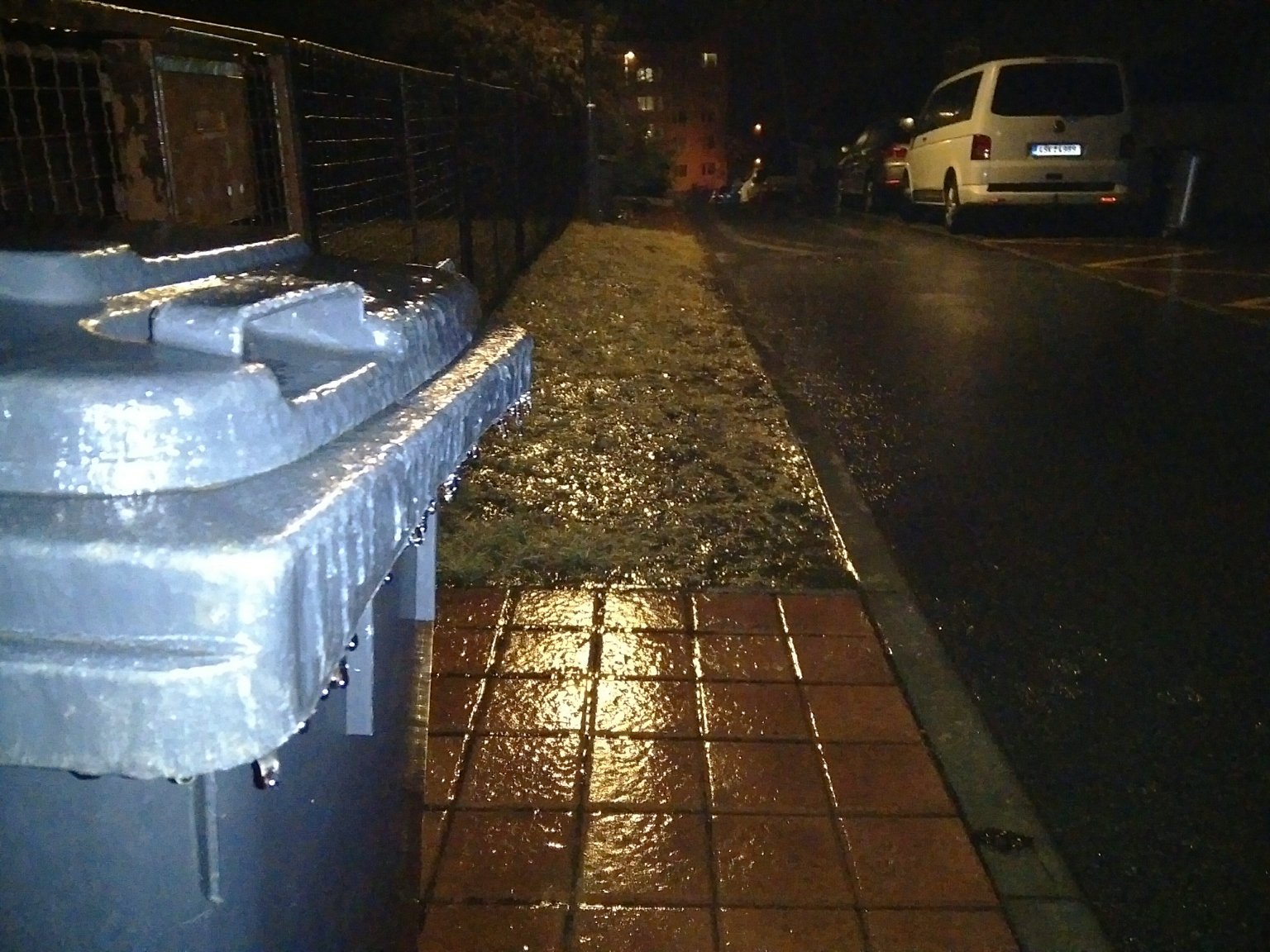 Na souvislou vrstvu ledovky, která pokryla vše, nyní padá něco jako poloroztopený led.