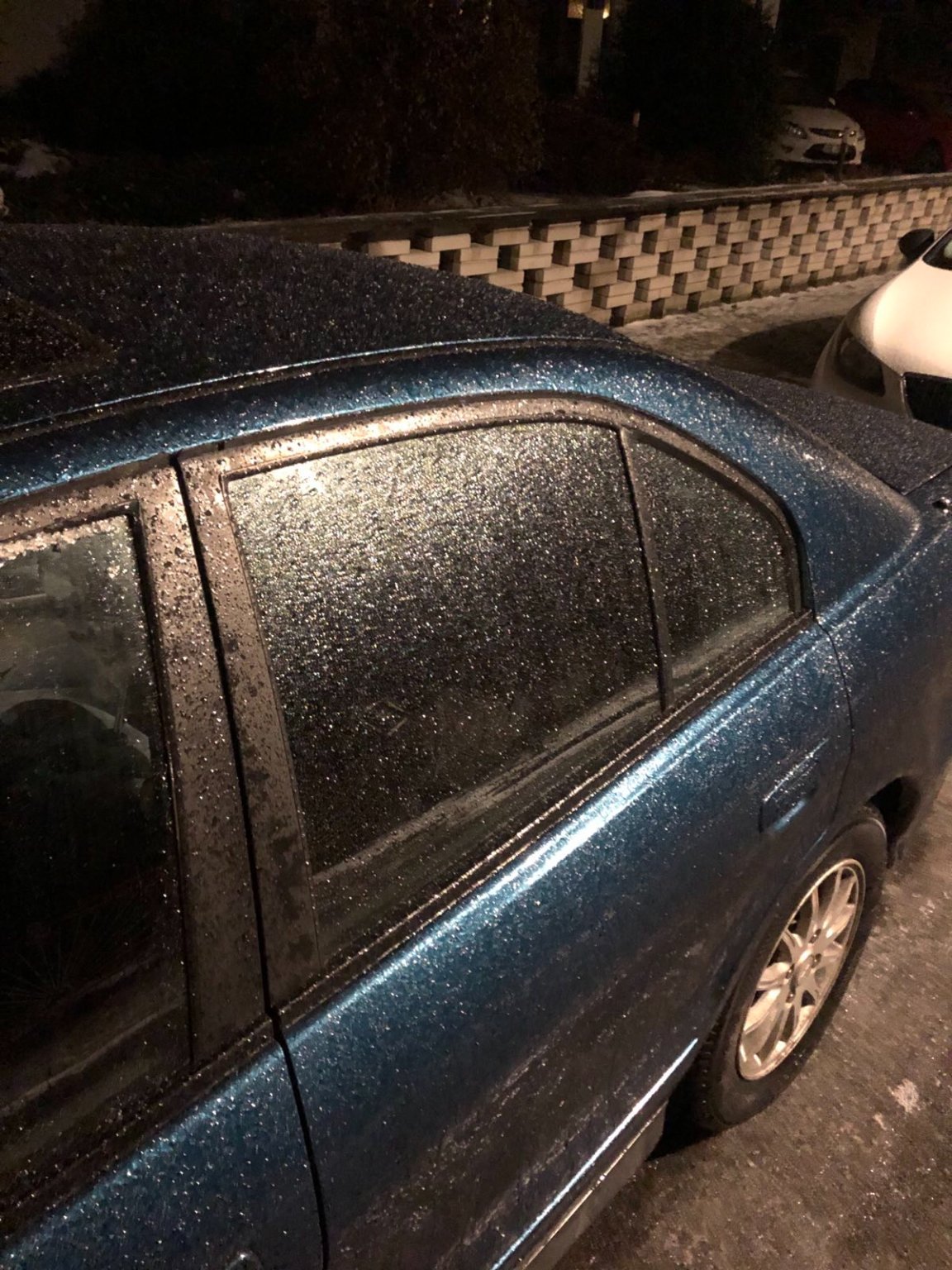 Slabá mlha. Teplota lehce nad nulou 0,1°C. Silnice trochu klouže, ale není to naštěstí taková hrůza, je to taková pololedová tříšť. Auto šlo docela pěkně očistit.
