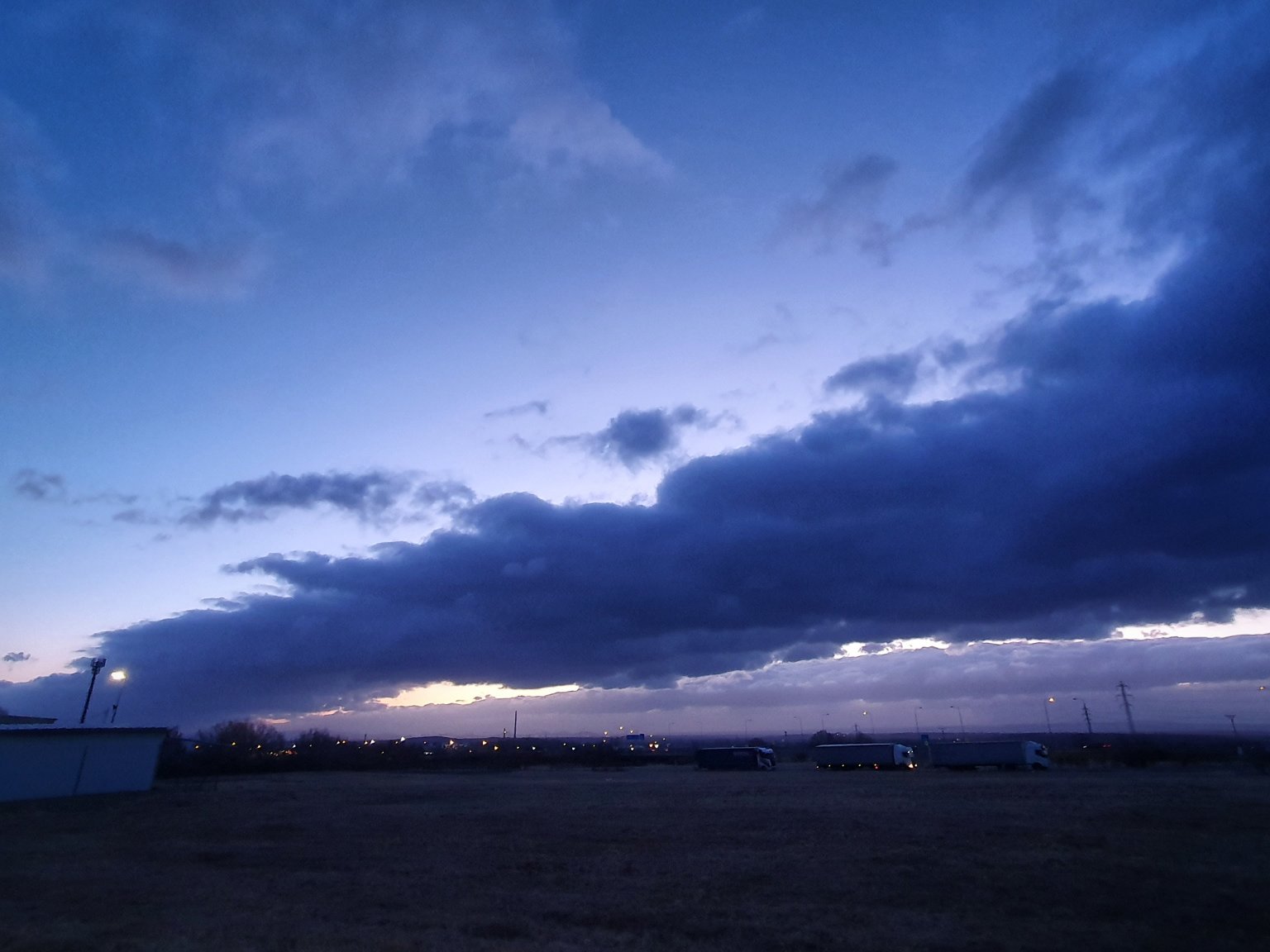 Oblačno, silný západní vítr, tlak 1020 hPa.